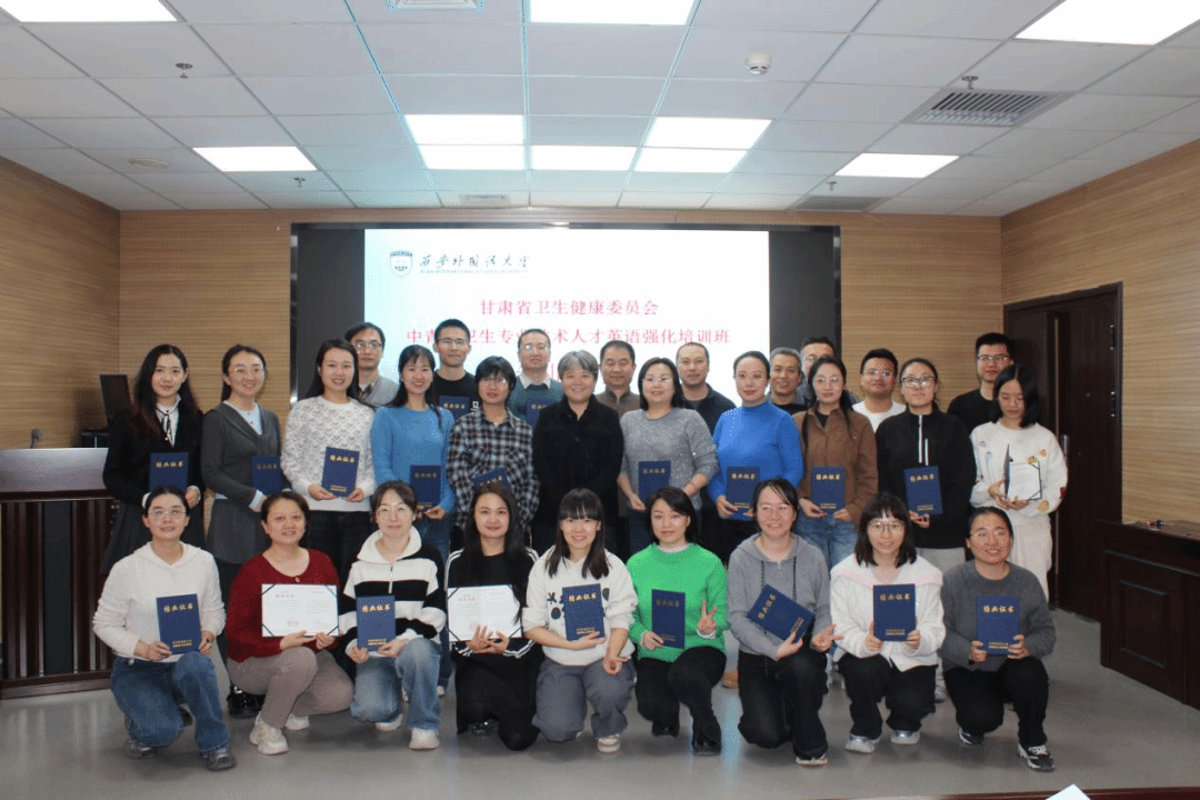 2026年1月15日下午,甘肃省卫生健康委员会英语强化培训班结业典礼在西安外国语大学雁塔校区举行。典礼现场气氛热烈,甘肃卫健委英语强化培训班学员与我校教师、管理团队齐聚一堂,共同回顾学习历程,庆祝培训圆满完成。